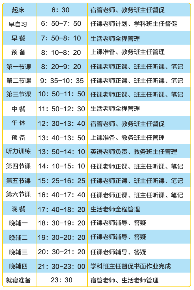 班级指导老师、教务班主任、学科班主任三位一体,24小时无缝衔接式管理。学习、生活、心理均专人专项管理。